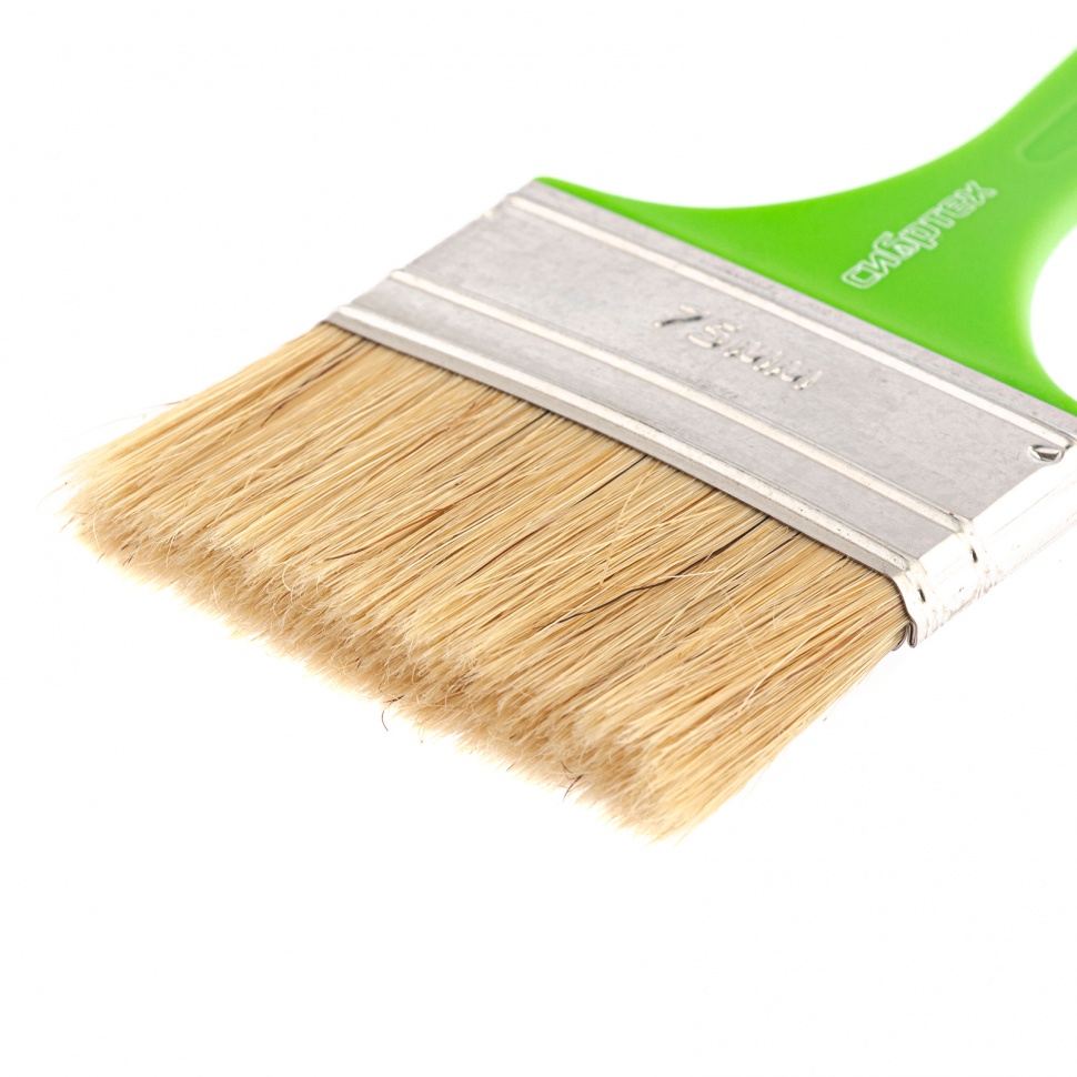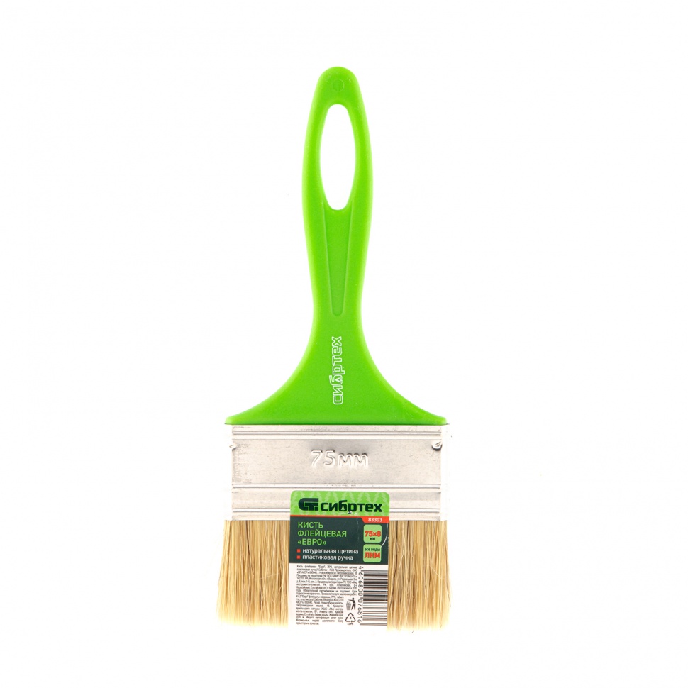 Кисть флейцевая Сибртех «Евро» 83303 шириной 75 мм и толщиной 8 мм, с натуральной щетиной и пластиковой ручкой, предназначена для первичного окрашивания либо создания финишного слоя на небольших или узких участках поверхности. Кисть обладает хорошими краскообменными качествами и подходит для любых видов лакокрасочных материалов (ЛКМ).ПреимуществаНатуральная щетина двойной выварки обеспечивает высокое качество декоративного покрытия.Кисть хорошо поглощает и отдает краску, т.к. щетинки расщеплены на концах.Натуральная щетина устойчива к воздействию агрессивных сред и не теряет рабочих свойств при контакте с ЛКМ на основе растворителей.Оптимально подобранный клеевой состав, клинья и металлический бандаж надежно удерживают щетину.Бандаж имеет антикоррозионное покрытие, поэтому кисть можно замачивать в воде и растворителе.Легкая пластиковая рукоятка не утяжеляет кисть и удобно ложится в руку.На рукоятке есть отверстие, за которое кисть можно подвешивать.
