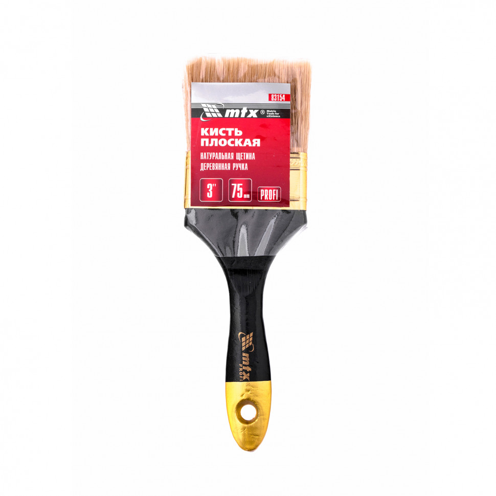 Плоская кисть «Профи» MTX 83154, 3 дюйма, с натуральной щетиной и деревянной ручкой, рассчитана на профессиональное использование при проведении малярных работ. Натуральная щетина с увеличенной плотностью набивки универсальна по своему применению и подходит для нанесения различных типов ЛКМ, в том числе с содержанием растворителей. Кисть шириной 75 мм применяется при необходимости окрашивания больших поверхностей.ПреимуществаКисть премиум качества легко выдерживает интенсивное и многократное использование.Щетина прошла двойную выварку, такая технология изготовления исключает попадание посторонних примесей на окрашиваемую поверхность.Высокий ресурс кисти обеспечивает бандаж, который предотвращает выпадение щетины.Антикоррозийное покрытие на бандаже не допускает образования ржавчины, поэтому кисть можно мыть и чистить.С помощью расщепленной на концах кисти можно создать ровное и качественное покрытие, т.к. она отличается высокими показателями впитываемости и отдачи краски.Рукоятка кисти выполнена из отборной древесины, которая шлифуется и покрывается лаком для комфортного использования.Кисть оснащена отверстием для подвешивания, что обеспечивает возможность практичного хранения.