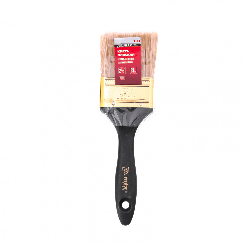 Плоская кисть «Профи» MTX 83163, 2,5 дюйма, с натуральной щетиной и пластмассовой ручкой, рассчитана на профессиональное использование при проведении малярных работ. Натуральная щетина с увеличенной плотностью набивки универсальна по своему применению и подходит для нанесения различных типов ЛКМ, в том числе с содержанием растворителей. Кисть шириной 63 мм применяется при необходимости окрашивания небольших участков .ПреимуществаКисть премиум качества легко выдерживает интенсивное и многократное использование.Щетина прошла двойную выварку, такая технология изготовления исключает попадание посторонних примесей на окрашиваемую поверхность.Высокий ресурс кисти обеспечивает бандаж, который предотвращает выпадение щетины.Антикоррозийное покрытие на бандаже не допускает образования ржавчины, поэтому кисть можно мыть и чистить.С помощью расщепленной на концах кисти можно создать ровное и качественное покрытие, т.к. она отличается высокими показателями впитываемости и отдачи краски.Рукоятка кисти выполнена из пластмассы, устойчивой к механическим повреждениям.Кисть оснащена отверстием для подвешивания, что обеспечивает возможность практичного хранения.