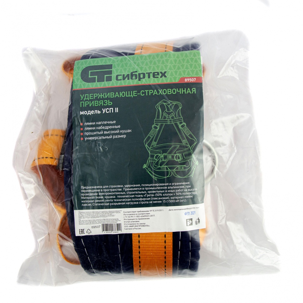 Удерживающе-страховочная привязь Сибртех модель УСП II 89507 с высоким кушаком и наплечными/набедренными лямками позволяет соблюсти технику безопасности при выполнении работ на высоте. Пригодится строителям, монтажникам, кровельщикам, а также сотрудникам МЧС.ПреимуществаБольшой монтажный карабин и 3 металлических D-кольца обеспечивают надежное позиционирование работника.Ремень изготовлен из высокопрочной лавсановой ленты, устойчивой к разрывам и истиранию.Высокий прошитый кушак снижает усталость в спине даже при длительном использовании привязи.Привязь универсального размера легко застегивается, т.к. имеет быстрозатягивающиеся регулировочные пряжки.На передней части страховочного ремня (в области груди) предусмотрена вспомогательная лента для быстрого застегивания и отстегивания привязи.Полиэфирная лента, из которой выполнен предохранительный строп, обеспечивает устойчивость к статическим нагрузкам не менее 15 кН (1500 кгс).Оптимальная длина стропа 1,5 м (включая соединительные элементы) позволяет использовать изделие для большинства работ на высоте.На изделие предоставляется двухлетняя гарантия от производителя.Ремень с наплечными лямками соответствует требованиям ТР ТС 019/2011.
