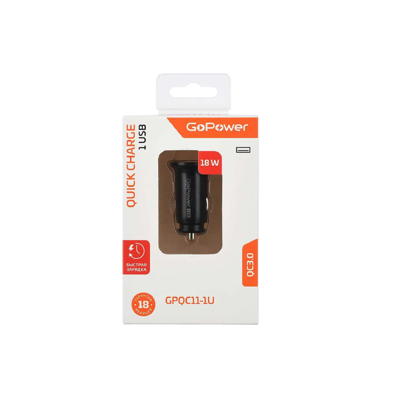 Автомобильное зарядное устройство в машину GPQC11-1U от GoPower имеет один USB-выход, совместим с любым кабелем или шнуром. Поддерживает функцию быстрой зарядки 18W для QC3.0, QC2.0, FCP, AFC, DCP. Чтобы блок питания выдавал быструю зарядку, необходимо подключать зарядный кабель поддерживающий быструю зарядку, так же ваше устройство должно поддерживать быстрый заряд.