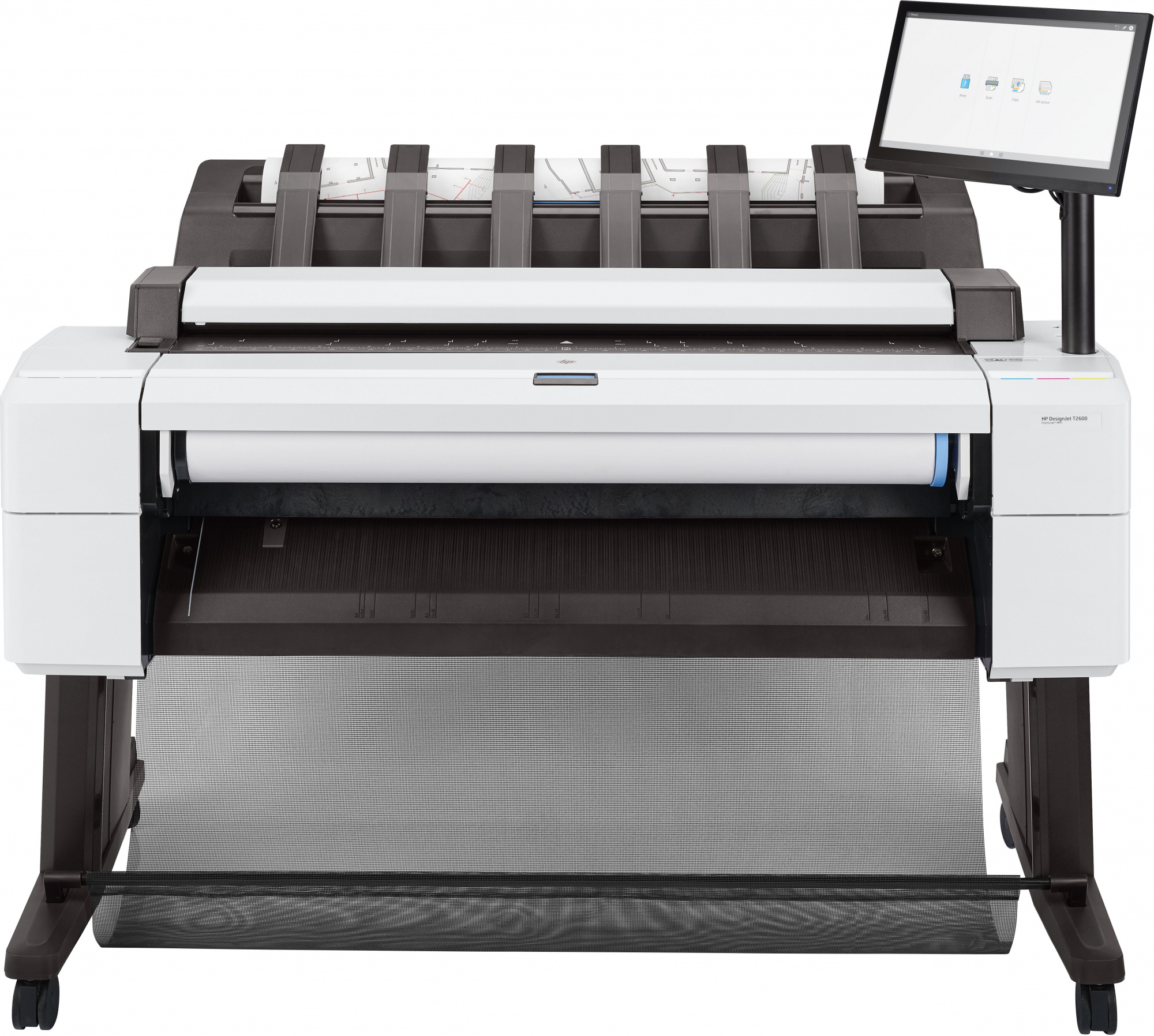HP Designjet T2600 – широкоформатный МФУ формата 36″. Выпускается в стандартной модификации и с лотком для двух рулонов бумаги, при этом обе модели поддерживают PostScript. Характеристики печати и функционал идентичны модели плоттера T1600, за исключением встроенного сканера.